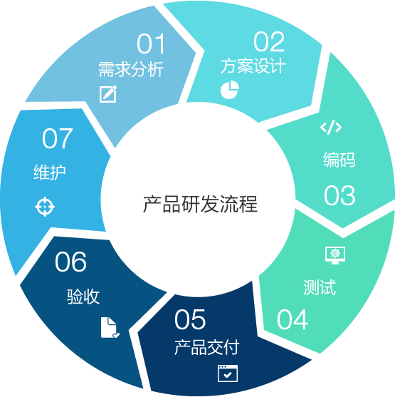 規(guī)范化的產(chǎn)品研發(fā)流程: 需求分析--方案設(shè)計(jì)—編碼—測(cè)試—產(chǎn)品交付—產(chǎn)品驗(yàn)收—維護(hù); 提高效率,改善產(chǎn)品,讓產(chǎn)品和團(tuán)隊(duì)都能夠輕裝上陣,走得更遠(yuǎn)。